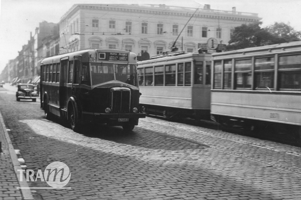 Octobre 1947, l’autobus Minerva AB4R 101 de la ligne O croise une motrice de la ligne 1 à hauteur de la Colonne du Congrès.